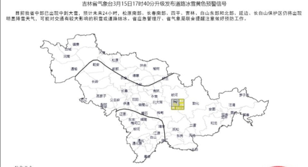 吉林省气象台3月15日17时40分升级发布道路冰雪黄色预警信号:目前我省中部已出现中到大雪,预计未来24小时,松原南部、长春南部、四平、吉林、白山东部和北部、延边、长白山保护区仍将出现明显降雪天气,可能对交通有较大影响的积雪或道路结冰。省应急管理厅、省气象局联合提醒注意做好预防工作。