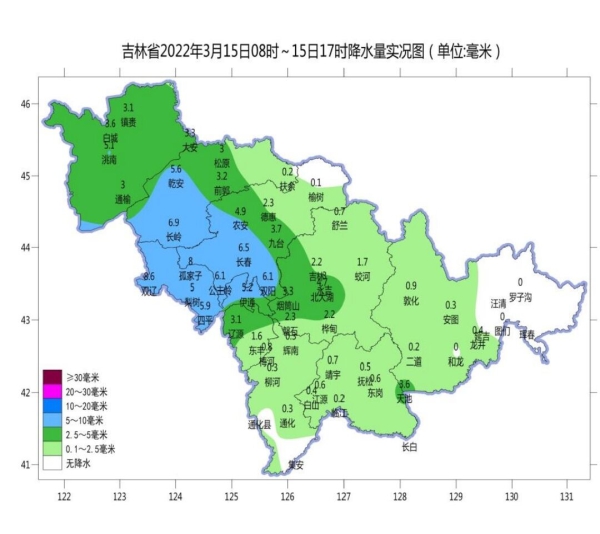 截至15日17时,全省平均降水量2.4毫米,主要出现在中西部,地区分布:四平6.5毫米,长春4.2毫米,松原3.8毫米,白城3.6毫米,吉林2.5毫米,辽源2.4毫米,其他地区不足1毫米。降水以雪或湿雪为主,部分地方出现短暂雨或雨夹雪,中西部11个测站出现大雪、13站中雪,降水量前十位:双辽8.6毫米,孤家子8毫米,长岭6.9毫米,长春市区6.5毫米,公主岭6.1毫米,双阳6.1毫米,四平市区5.9毫米,乾安5.6毫米,伊通5.2毫米,洮南5.1毫米。