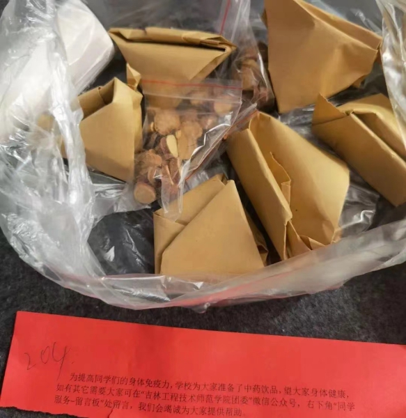 3月16日,吉林工程技术师范学院新闻与出版学院的学生们收到了一份特殊的礼物一一爱心物资礼包,里面有一份中药饮,助力同学强身健体。