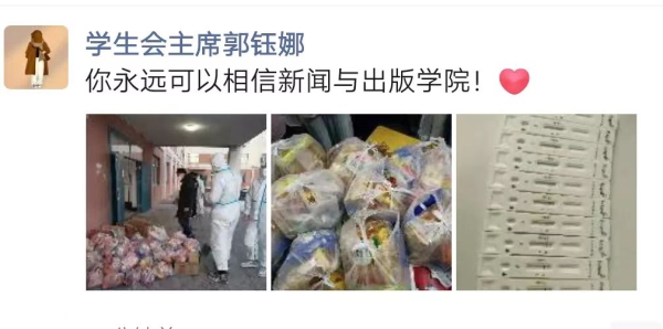 在这个特殊时期,这份爱心礼包是新闻与出版学院的领导们带领教职工连夜为学院封闭在寝室的学生们捐款购买的,希望封闭中的同学们能够以平常心面对非常事,保持积极乐观的精神。同学们深受感动和鼓舞并纷纷留言表达感谢。
