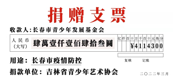 近日,长春市青少年发展基金会收到一笔来自吉林省青少年艺术协会的41143元的捐款,这笔捐款将被用于长春市疫情防控工作。