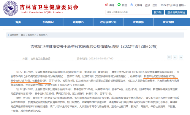 据吉林省卫健委官方发布:3月27日0-24时,全省新增本地确诊病例1086例(轻型1079例、普通型6例、重型1例),其中长春市706例(含120例无症状感染者转为确诊病例)、吉林市367例(含80例无症状感染者转为确诊病例)、四平市11例、辽源市1例(无症状感染者转为确诊病例)、松原市1例;新增本地无症状感染者907例,其中吉林市571例、长春市330例、四平市5例、松原市1例。