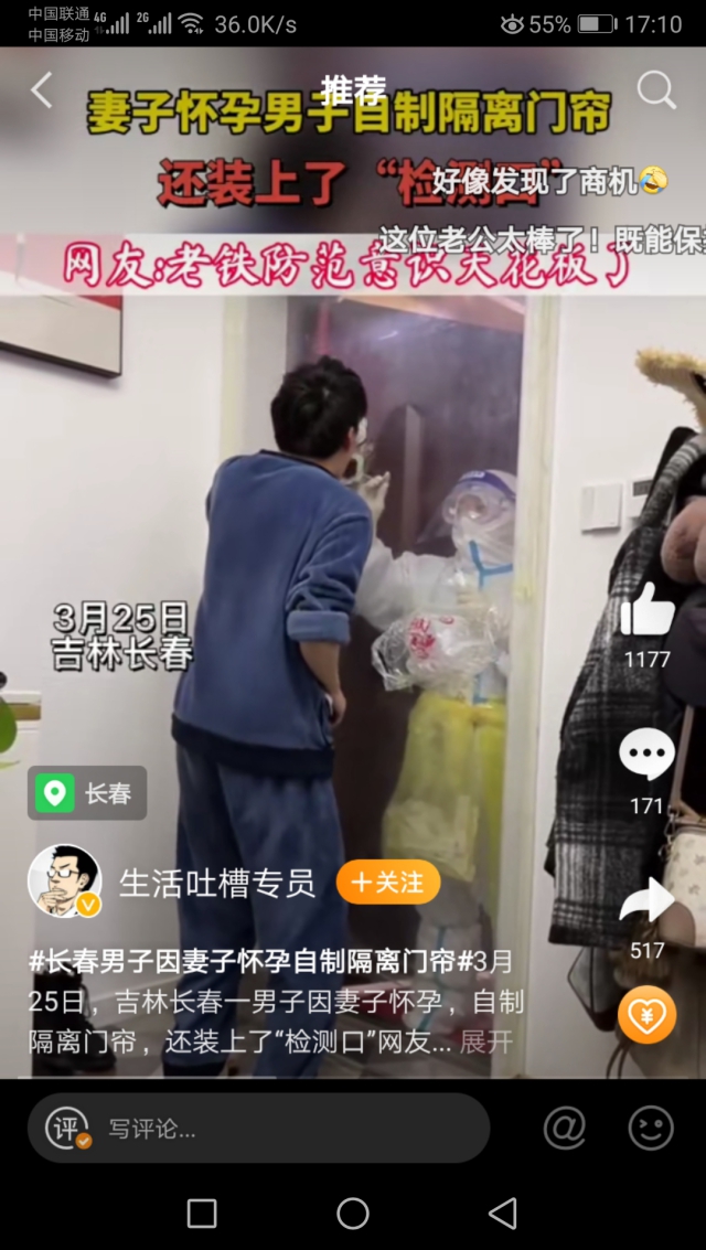 近日,吉林长春。一男子因妻子怀孕,在家中自制了“隔离门帘”,当“大白”进户做核酸时,把安全性升到最高。