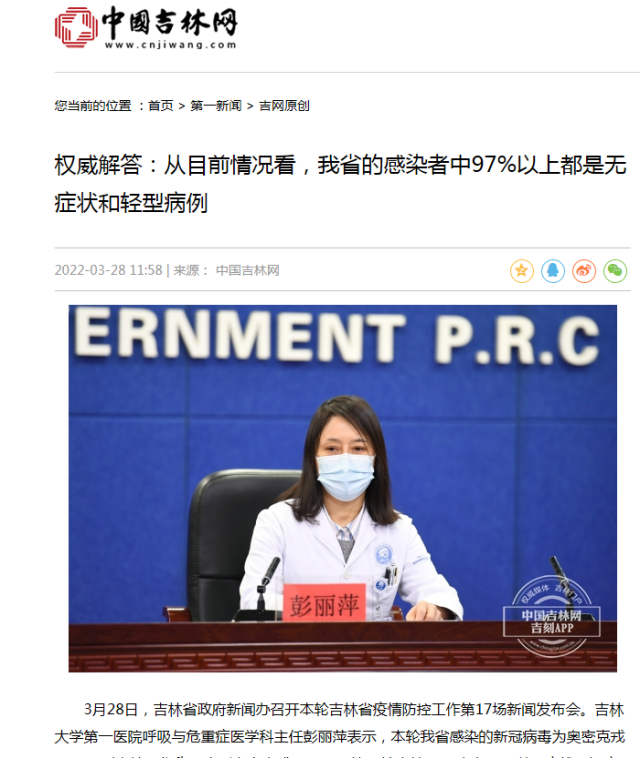 3月28日,吉林省政府新闻办召开本轮吉林省疫情防控工作第17场新闻发布会。吉林大学第一医院呼吸与危重症医学科主任彭丽萍表示,本轮我省感染的新冠病毒为奥密克戎BA.2亚型毒株,俗称“隐形奥密克戎”。BA.2比原始毒株BA.1毒力弱,以无症状及轻症感染者居多,因此传播更隐匿,传染性更强,传播速度更快,早期难以发现,给及时切断传播链带来很大的挑战。从现在掌握的数据来看,重症及危重症比例很低,死亡率低,所以不必恐慌。