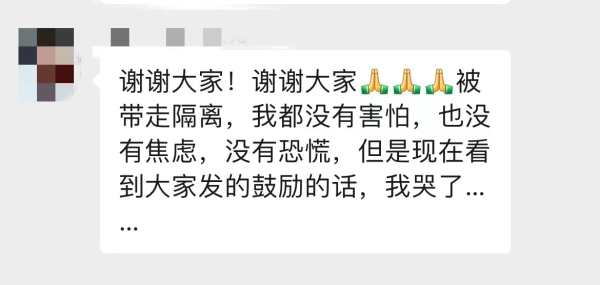 在看了邻居的留言后,309号居民感动地说,自己看到检测结果的时候没哭,去隔离点的时候没哭,“但是我现在很想哭,谢谢大家。”