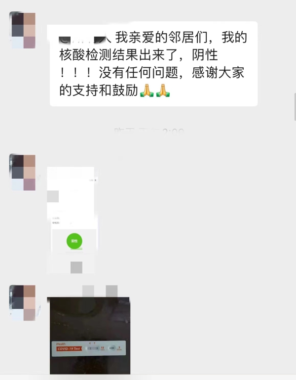 4月4日晚,309号居民在社区群内报来喜讯,她的鼻咽拭子核酸检测,结果为阴性。4月5日上午,她的自测结果也是阴性。4月5日上午,她发来了第二次鼻咽拭子核酸检测结果,结果仍然是阴性。309号居民说:“出于安全考虑,我会在隔离点一段时间,感谢大家的支持和鼓励,我想我们很快就会见面的。”