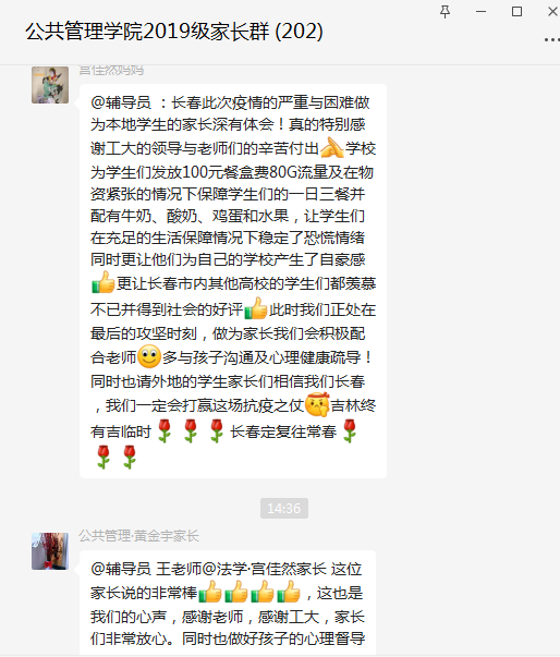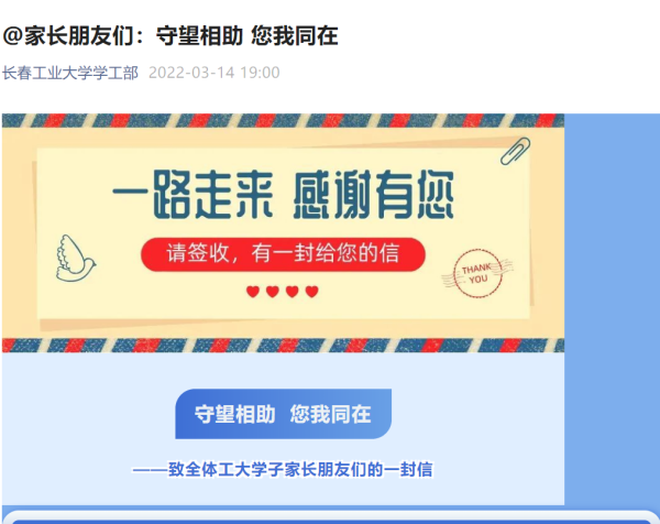 3月14日,学校通过学工部微信公众号第一时间发布了《致全体家长朋友的一封信》,全面介绍了学校疫情防控工作的开展情况,希望家长深刻认识当前校园疫情防控形势的紧迫性、严峻性和复杂性,督促学生自觉遵守学校规章制度,积极配合学校和属地疫情防控工作,倡导家长加强与学生的线上联络和情感沟通,保持家校信息通畅互享。广大家长也通过发送微信、短信,视频寄语,平台留言,书写感谢信等方式与学校师生展开互动,对学校广大领导干部与学生同吃同住、严防严控表示感谢,为学校和学生加油鼓劲。