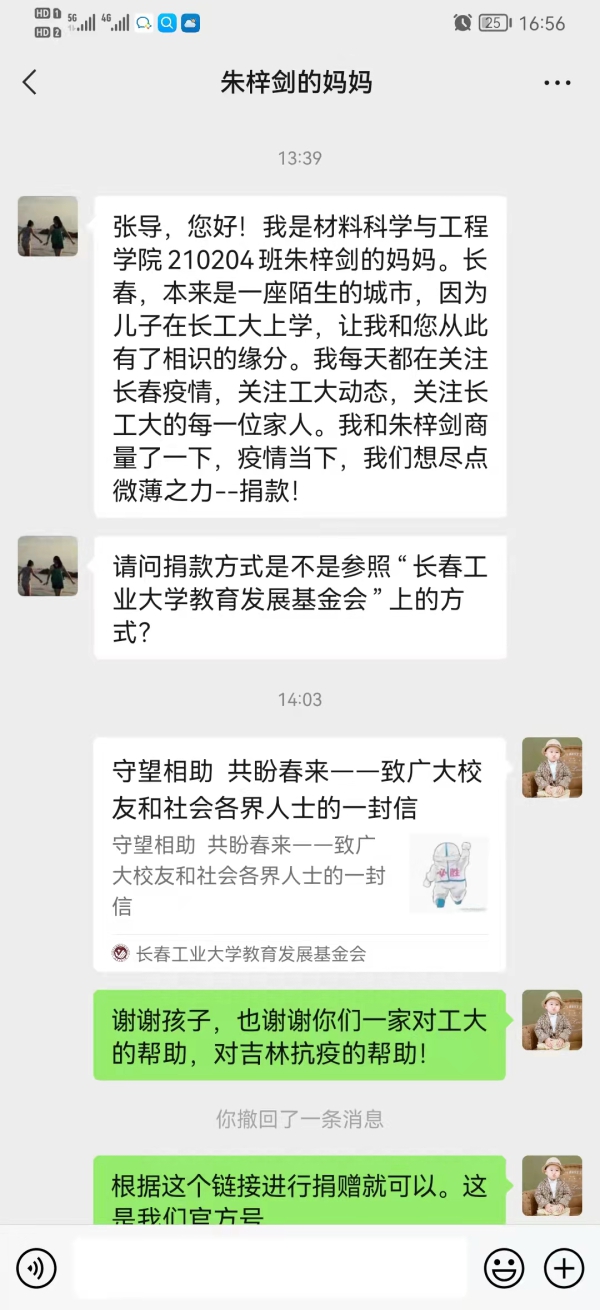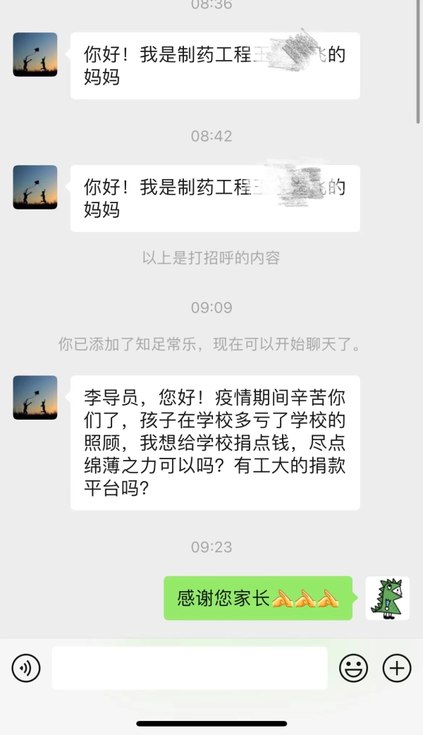 “杨老师您好,孩子进入学校以后思想、学习和生活上都有很大进步,这都得益于学校和学院的培养,看到学校领导和学院老师们为保证孩子安全做出的努力和辛苦很感动,希望自己能够为学校的抗疫工作尽一份绵薄之力。”这是国际教育学院193612班王浩宇同学家长给辅导员杨娇华老师发的微信。3月16日,学校通过教育发展基金会向广大校友和社会各界发出号召,国际教育学院193609班宫浩添同学家长第一时间快速响应,向学校捐赠了50套防护服、30双鞋套、8000只口罩,总价值10000元,王浩宇同学家长向学校捐赠10000元;应用技术学院212409班张万坤同学家长向学校捐赠20000只医用外科口罩,总价值7000元;化学工程学院190606班王子逸飞同学家长向学校捐赠1666元,聚水成河,聚沙成塔,广大家长纷纷通过相关渠道慷慨解囊,助力学校抗击疫情,表达对奋战在防疫一线老师们的牵挂和敬意。