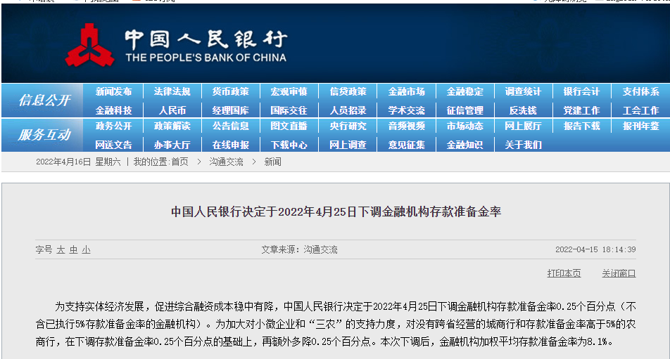 16日,中国吉林网注意到,为支持实体经济发展,促进综合融资成本稳中有降,中国人民银行决定于2022年4月25日下调金融机构存款准备金率0.25个百分点(不含已执行5%存款准备金率的金融机构)。为加大对小微企业和“三农”的支持力度,对没有跨省经营的城商行和存款准备金率高于5%的农商行,在下调存款准备金率0.25个百分点的基础上,再额外多降0.25个百分点。本次下调后,金融机构加权平均存款准备金率为8.1%。