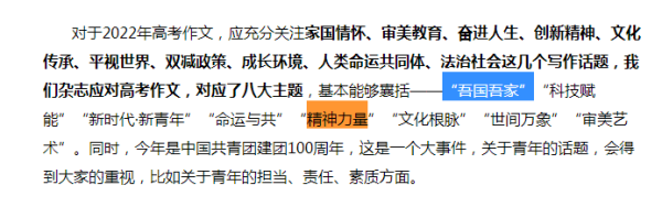 彼时,长春吉大附中实验学校高三语文备课组组长、中学高级教师杨丽伟老师表示,高考作文是考察时代意义和价值导向的。高考作文围绕社会主义核心价值观,贴近时代、贴近社会、贴近学生实际。考生应关注时代,关注国内外环境,关注热点,如:建党百年,北京冬奥会,神舟十三号载人飞行任务取得圆满成功等。