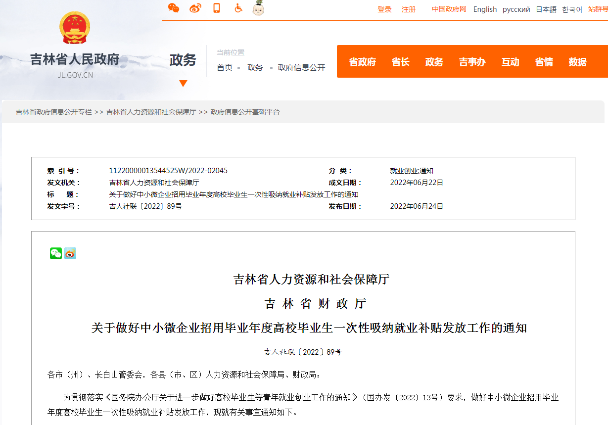 24日,中国吉林网从吉林省人民政府网站获悉,吉林省人力资源和社会保障厅和吉林省财政厅联合发文,做好中小微企业招用毕业年度高校毕业生一次性吸纳就业补贴发放工作。@吉林省行政区域内登记注册的中小微企业,符合条件的可以申报。