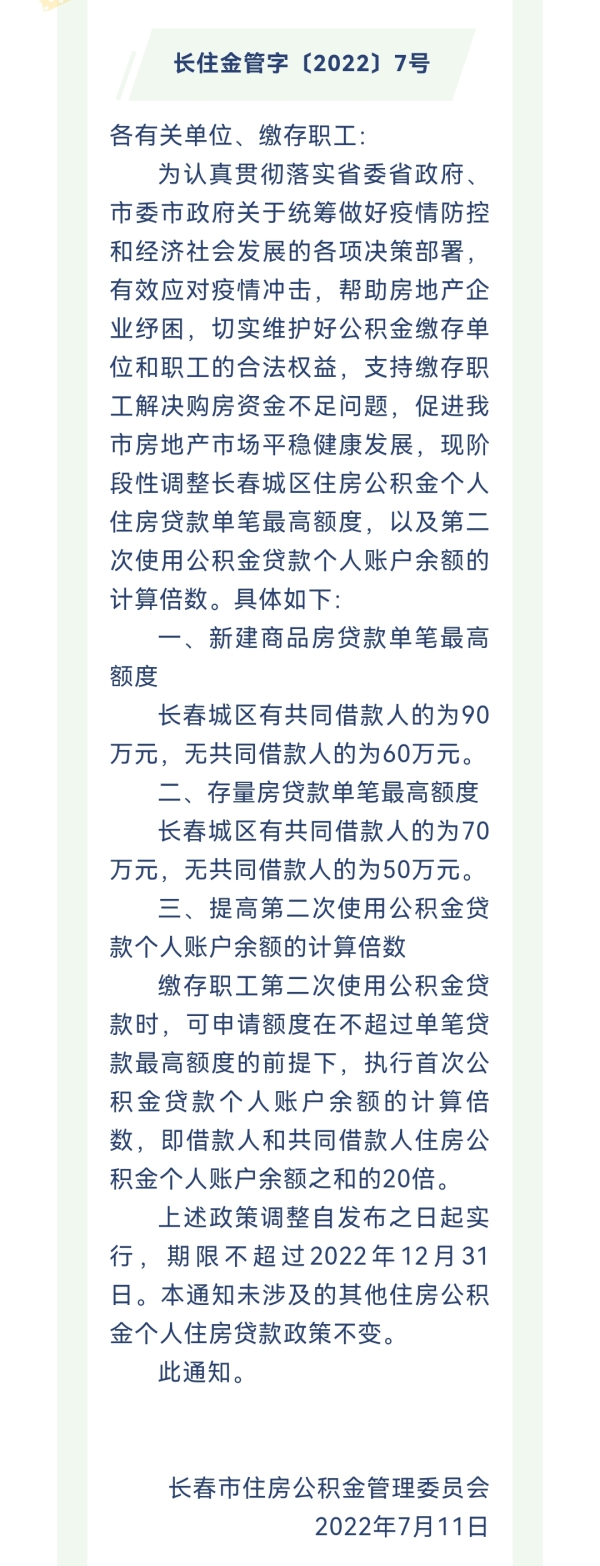 中国吉林网获悉,7月11日,长春市住房公积金管理中心发布了调整住房公积金个人住房贷款政策的通知,推出了阶段性调整购房贷款单笔最高额度和第二次使用公积金贷款个人账户余额的计算倍数。