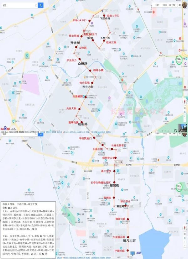 高新6号线由欧亚汇集始发,途经伟业星城、咖啡小镇、华润凯旋门等众多居民小区和修正药业、长春生物集团、惠仁学校,终点至中海兰庭小区,与八一水库景区相邻,整条线路纵向贯穿高新区南北,为增加线路横向辐射度,根据高新区道路情况,营运线路多处设计为“S”型,在始发站欧亚卖场商圈,上下行站台设计落在欧亚汇集、欧亚卖场1号门、20号门、14号门繁华地段。