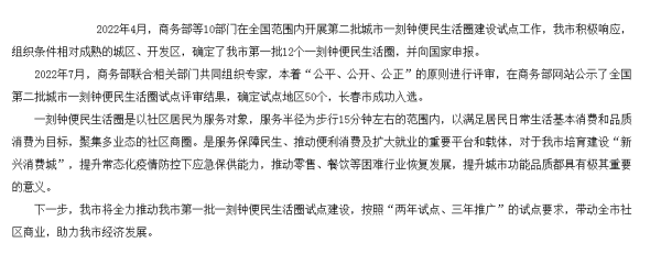 2022年7月,商务部联合相关部门共同组织专家,本着“公平、公开、公正”的原则进行评审,在商务部网站公示了全国第二批城市一刻钟便民生活圈试点评审结果,确定试点地区50个,长春市成功入选。