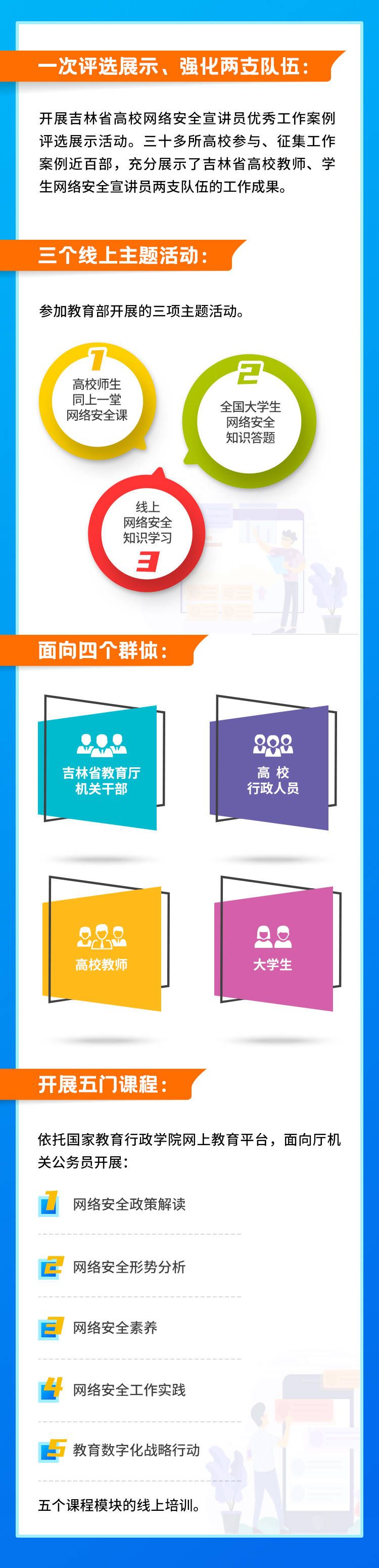 9月6日,全国网络安全宣传周校园日来临之际,吉林省教育系统深入学习贯彻习近平总书记关于网络强国的重要思想,紧紧围绕迎接党的二十大胜利召开这条主线,紧扣 “网络安全为人民、网络安全靠人民”主题,开展了12345系列网络安全主题宣传活动。