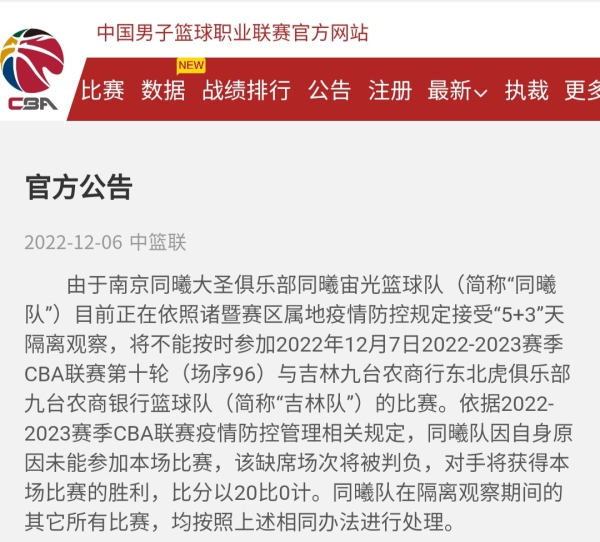 根据相关规定,凡抵达诸暨赛区球队,均需要接受“5+3”天隔离观察,而南京同曦目前正在隔离观察期,所以,无法比赛的他们只能被判罚输球。