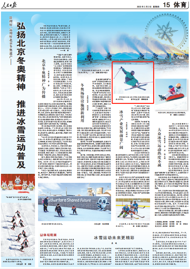 人民日报15版体育版以图片新闻报道滑雪爱好者在吉林万科松花湖度假区挑战跳台滑雪,折射出“后冬奥”时代,我省冰雪文化日益普及,场地设施不断健全,冰雪产业逐渐兴起,赛事活动日趋丰富,大众冰雪运动热情持续高涨,冰雪体育强省建设快马加鞭。
