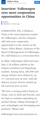 新华社面向全球播发英文报道《Interview: Volkswagen eyes more cooperation opportunities in China》,通过近日采访大众汽车集团管理董事会主席奥博穆,显示德方大众汽车集团看好中方市场、对奥迪一汽新能源汽车项目充满信心——在2022年复杂的市场环境下,一汽-大众稳住了基本盘,展现出强劲的市场经营韧性。