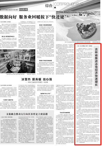 经济参考报7版综合版推出《吉林省推进冰雪经济快速增长》,关注吉林省冰雪经济亮眼数据,上冰面、进雪场、住民宿、吃特色,凸显了吉林省独特的冰雪旅游资源,后冬奥首个冰雪季,吉林打造出消费新场景,展现市场新活力。报道介绍,2023年春节假期,吉林省接待国内游客1154.67万人次,同比增长23.61%;实现国内旅游收入111.78亿元,同比增长33.31%。