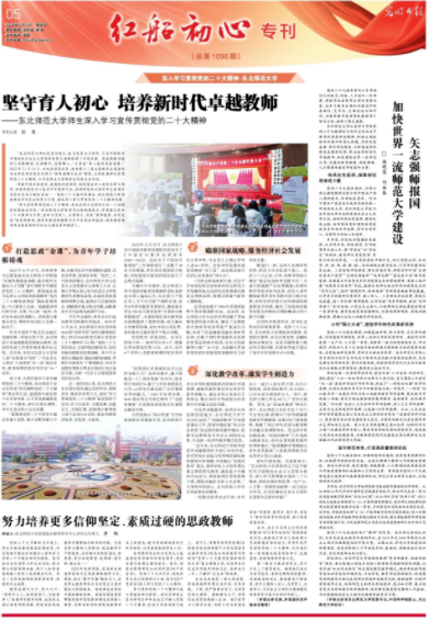 光明日报5版红船初心专刊(总第1096期)以整版的篇幅,宣介东北师范大学深入学习贯彻党的二十大精神,打造思政“金课”,为青年学子培根铸魂;瞄准国家战略,服务经济社会发展;深化教学改革,激发学生创造力;提出“创造的教育”理念,把培养卓越教师作为核心办学目标。