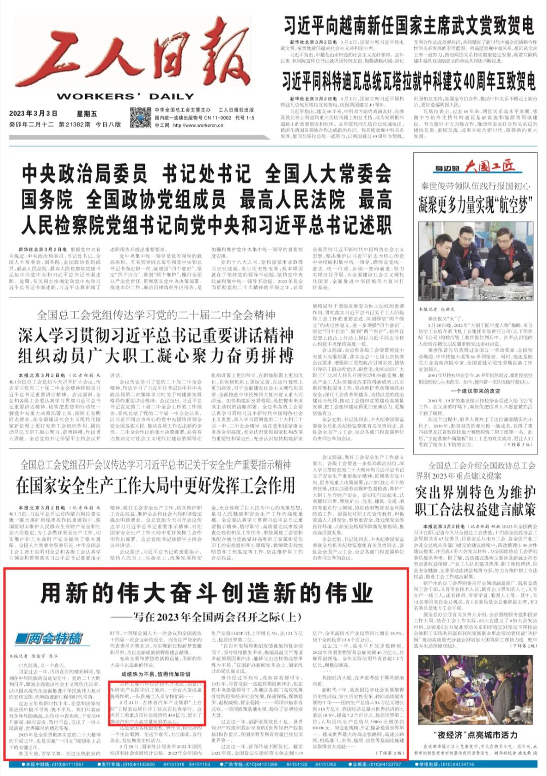 工人日报头版刊发两会特稿《用新的伟大奋斗创造新的伟业——写在2023年全国两会召开之际(上)》,其中以吉林省新年部署汽车产业集群“上台阶”工程为例,报道全国各地抢抓先机、抢占新局。