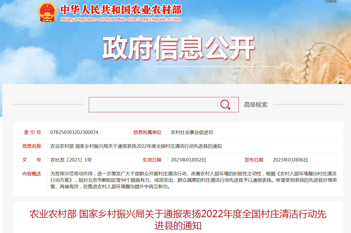 日前,农业农村部、国家乡村振兴局发布了关于通报表扬2022年度全国村庄清洁行动先进县的通知。对北京市朝阳区等94个措施有力、成效突出、群众满意的村庄清洁行动先进县予以通报表扬。