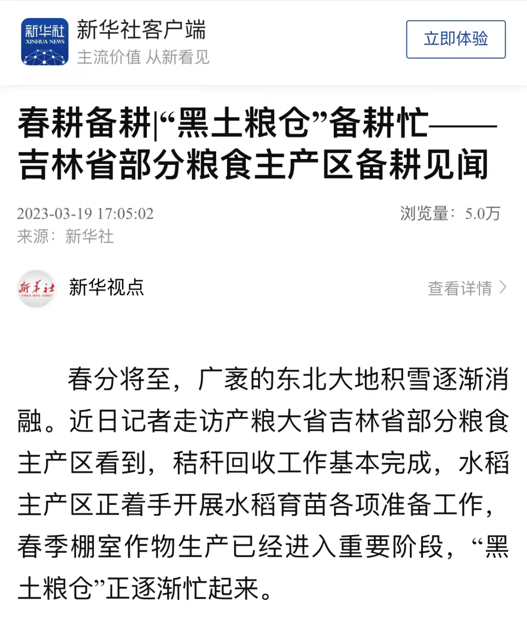 新华社客户端“春耕备耕”专栏推出《“黑土粮仓”备耕忙——吉林省部分粮食主产区备耕见闻》。从吉林市备春耕进展为切入点,报道吉林省部分粮食主产区秸秆回收工作基本完成,已开展水稻育苗各项准备工作,“黑土粮仓”备春耕工作已经铺开。