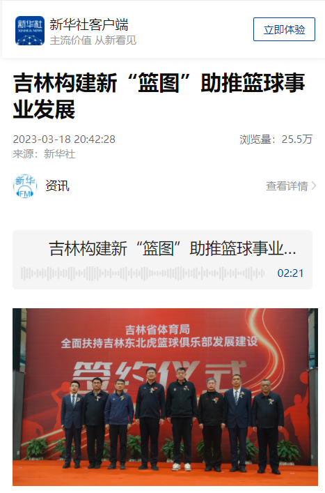 新华社客户端刊发《吉林构建新“篮图”助推篮球事业发展》,报道我省加大对吉林男篮扶持力度,助推吉林省篮球运动健康有序发展。