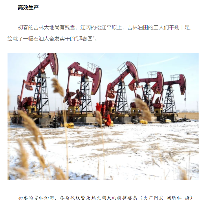 央广网“发现春之美”专栏刊发《鸟瞰春回大地 打卡中国各地奋斗第一线》,其中图片报道吉林油田的工人们干劲十足,绘就一幅石油人奋发实干的“迎春图”。