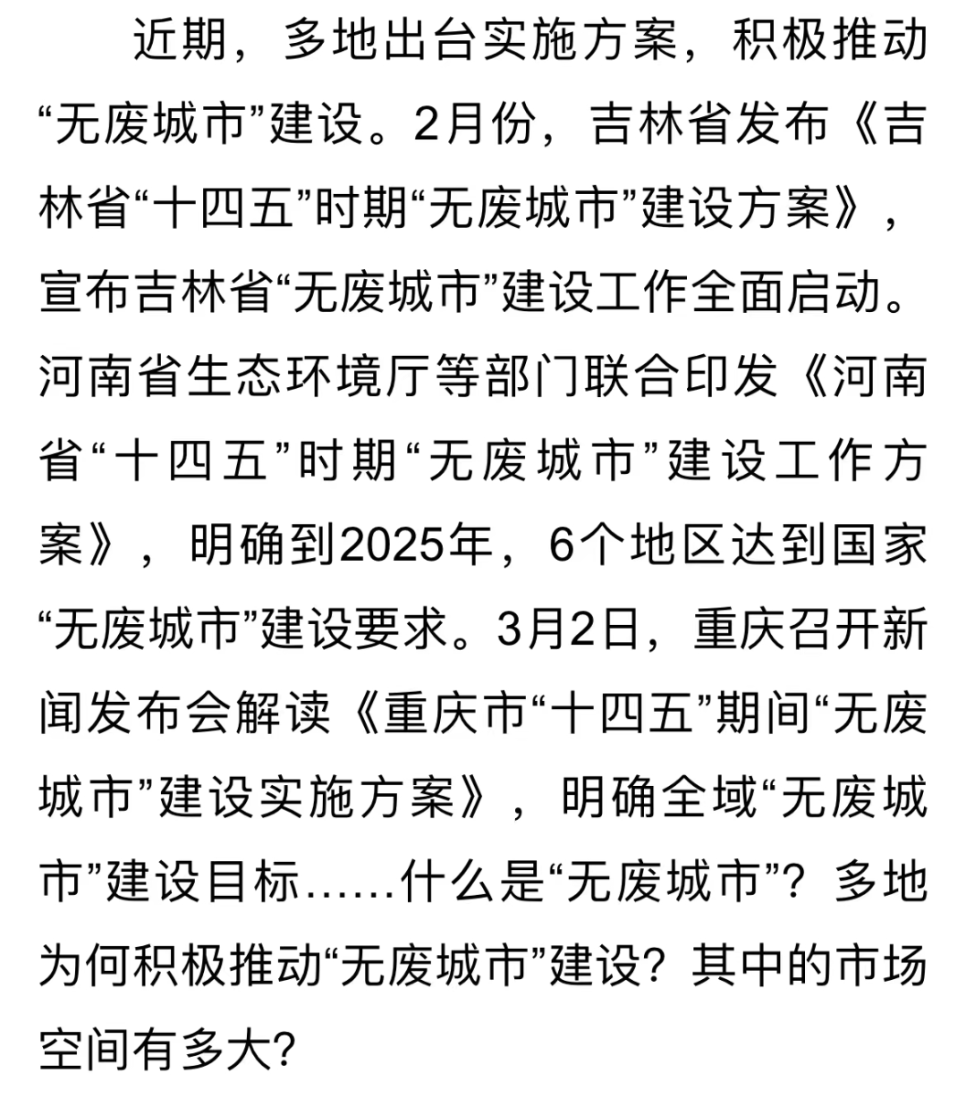 经济日报刊发综合稿件《“无废城市”建设提速》,开篇列举吉林省发布《吉林省“十四五”时期“无废城市”建设方案》。
