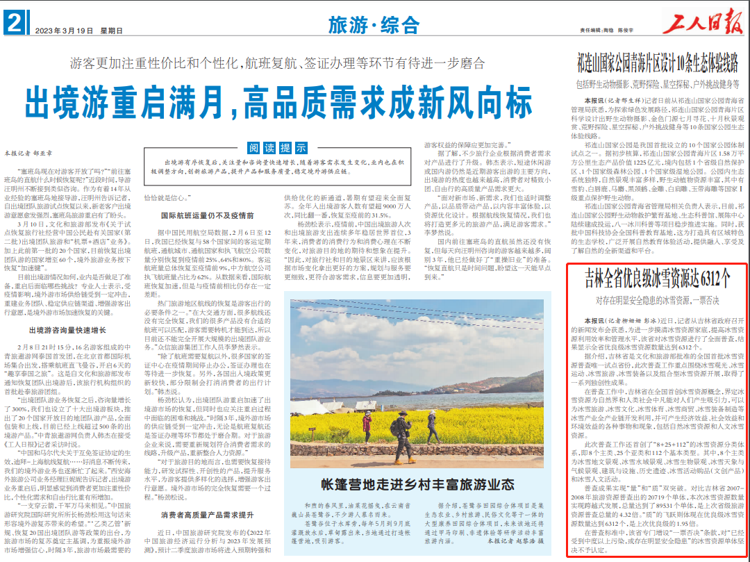 工人日报2版刊发《吉林全省优良级冰雪资源达6312个》,报道我省冰雪资源普查成果实现“量”和“质”双突破。