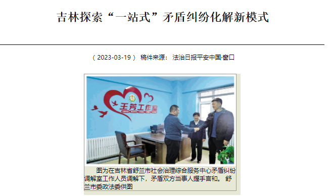 法治日报3版刊发《吉林探索“一站式”矛盾纠纷化解新模式》,报道我省全面推行“一站式受理、一揽子调处、一条龙服务”模式,进一步提升社会矛盾纠纷化解能力,形成多元化解矛盾纠纷新格局。