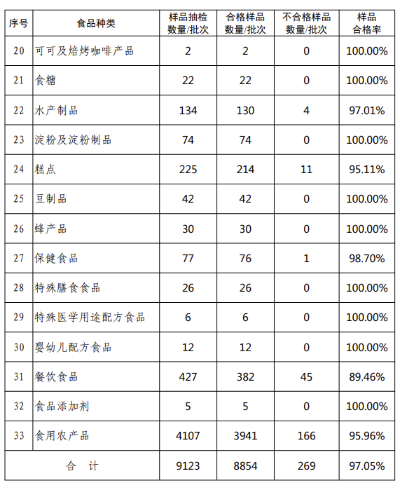 日前,中国吉林网获悉,2023年第一季度,吉林省共计公布9123批次食品样品监督抽检结果,其中合格样品8854批次,不合格样品269批次,样品总体合格率为97.05%。大宗日常消费品的合格率保持基本稳定,各类食品监督抽检结果见附件。