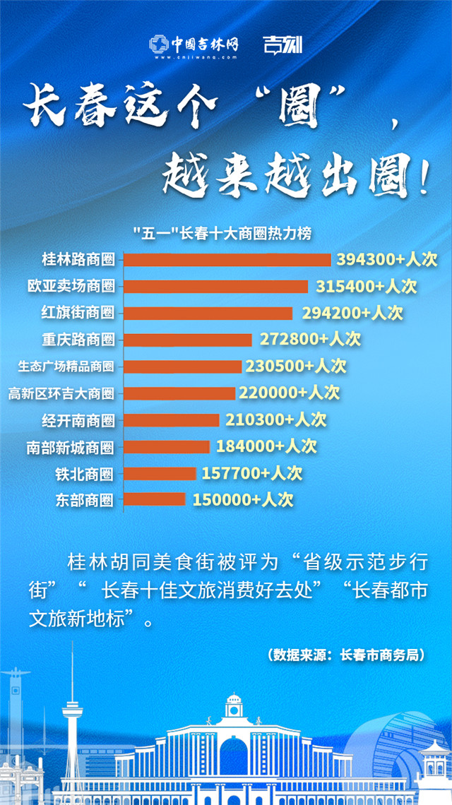 刚刚过去的“五一”假期,长春发布商圈热力榜。“五一”假期,长春十大商圈客流量达到243万人次,占长春市各大商圈“五一”假期总客流量的93%。其中:桂林路商圈成为最热打卡地,单日最大客流量接近10万人次。