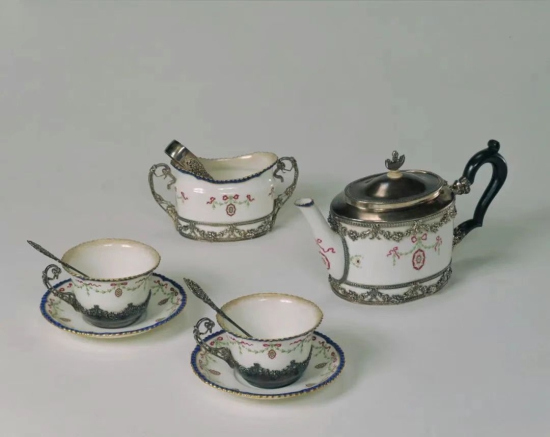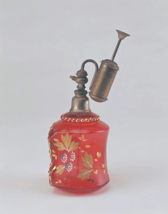 展出文物:铜架茶晶眼镜、银镶红宝石戒指、粉玻璃凸花描金半圆香水喷子、英国白釉彩花镶银咖啡具、幻灯机等。