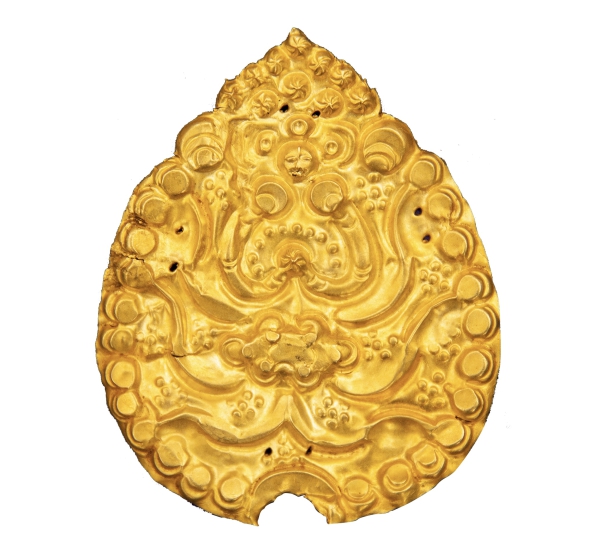 长春博物馆收藏的明代文物金牌饰,1986年出土于长春德惠朝阳乡双城子村顺城堂明墓。该器物由薄金片压制而成,形似树叶,正面有凸出的图案,在金饰的上下左右四处各有两个小孔。这件文物发掘出土时位于人头骨上方,应为墓主人帽冠上的饰物。