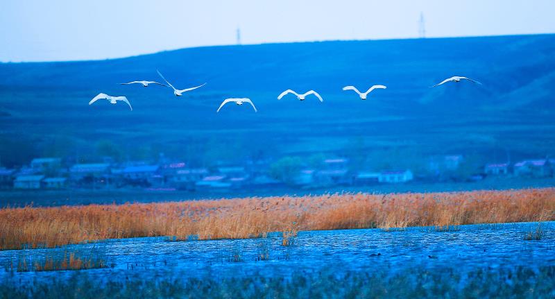 每年都有包括白头鹤、东方白鹳等“国宝级”的大批不同种类候鸟来此回迁、停歇,候鸟回迁、停歇时节,保护区内肥美的水草中,各类候鸟,时而在水中嬉戏觅食,时而翩翩起舞,时而结伴翱翔,构成了一幅人与自然和谐共生的美丽生态画卷,美不胜收,令人赏心悦目。
