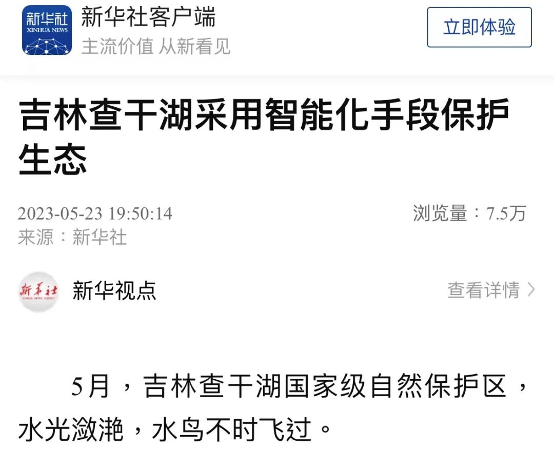 新华社客户端刊发《吉林查干湖采用智能化手段保护生态》,报道查干湖多个点位安装监测及配套设备,通过实时监测实现湿地资源管理、生物多样性管理、野生动物监测等功能,提高了保护区监管水平和效率。