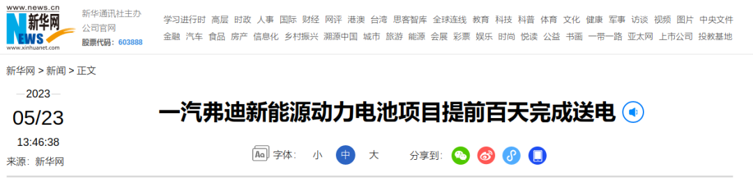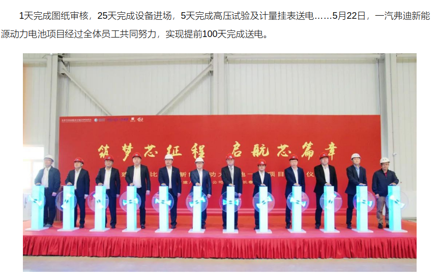 新华网刊发《一汽弗迪新能源动力电池项目提前百天完成送电》,报道吉林省新能源汽车领域的重量级项目、全省第一个汽车动力电池项目——一汽弗迪项目进展情况。
