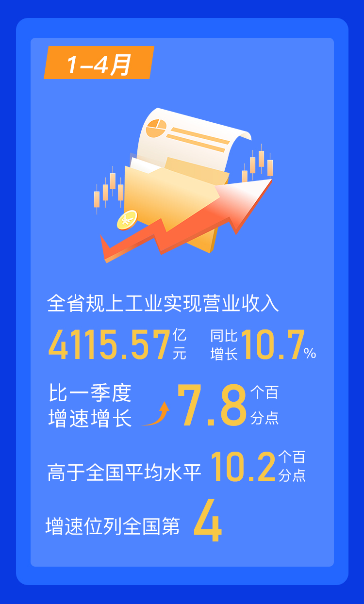 1-4月,全省规上工业实现营业收入4115.57亿元,同比增长10.7%,比一季度增速增长7.8个百分点。高于全国平均水平10.2个百分点,增速位列全国第4。