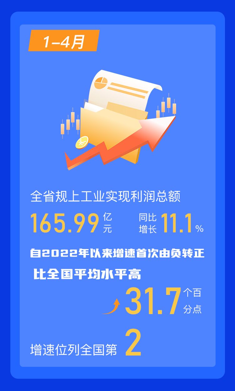 1-4月,全省规上工业实现利润总额165.99亿元,同比增长11.1%,自2022年以来增速首次由负转正,比全国平均水平高31.7个百分点,增速位列全国第2。