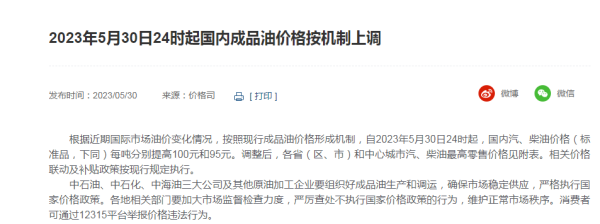 5月30日,国家发改委消息显示,根据近期国际市场油价变化情况,按照现行成品油价格形成机制,自2023年5月30日24时起,国内汽、柴油价格每吨分别提高100元和95元。