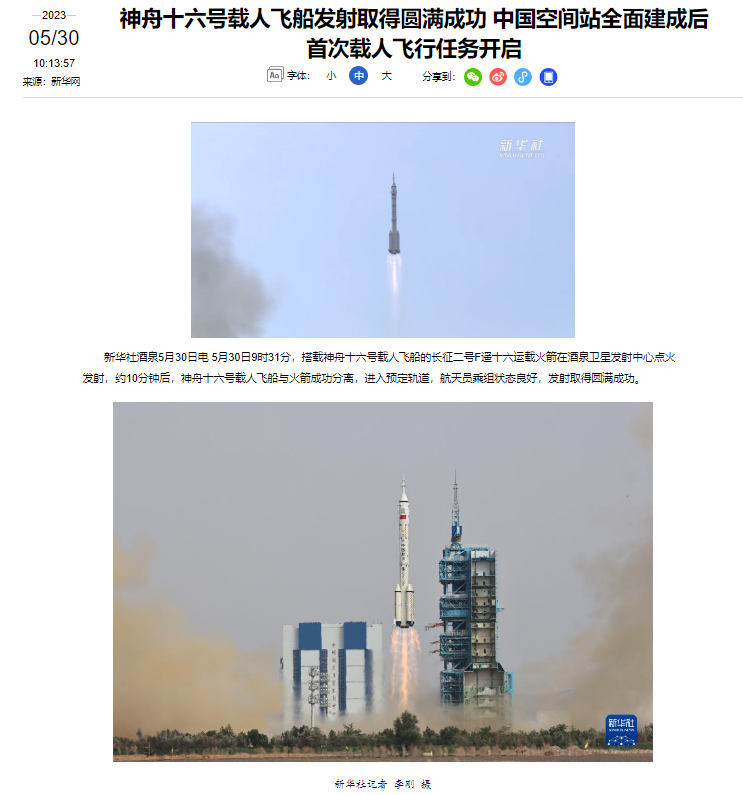 5月30日9时31分,搭载神舟十六号载人飞船的长征二号F遥十六运载火箭在酒泉卫星发射中心点火发射,约10分钟后,神舟十六号载人飞船与火箭成功分离,进入预定轨道,航天员乘组状态良好,发射取得圆满成功。