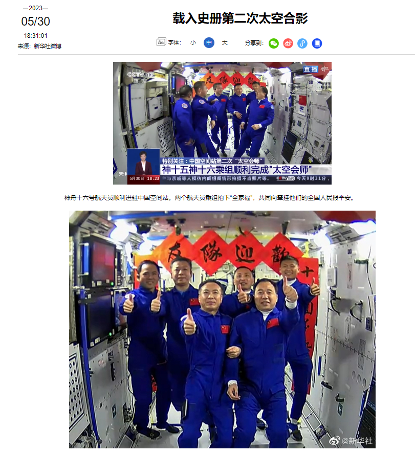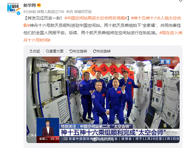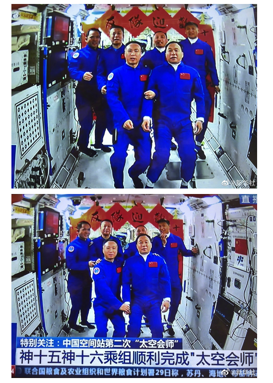两个航天员乘组拍下“全家福”,共同向牵挂他们的全国人民报平安。