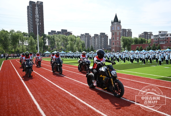 聚焦现场,检阅开始,由家长化身的“骑士”们驾乘着炫酷的摩托车首先亮相,十分抢眼,轰鸣的发动机声燃爆全场。