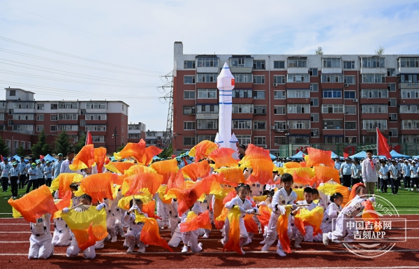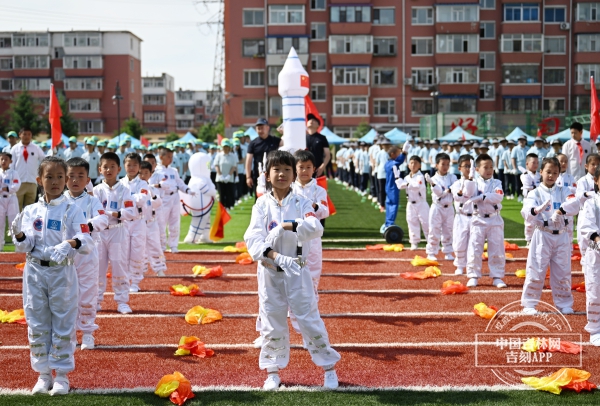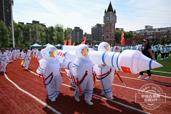 武术表演方队、篮球表演方队、金扇方队……最后一个出场的是以航天为主题的一年级方阵。“小小宇航员”身着白色服装,踏着坚定有力的步伐,向全体与会嘉宾和师生展示着“小小的个子,大大的梦想”。