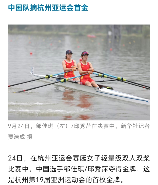 24日,在杭州亚运会赛艇女子轻量级双人双桨比赛中,中国选手邹佳琪/邱秀萍夺得金牌,这是杭州第19届亚洲运动会的首枚金牌。