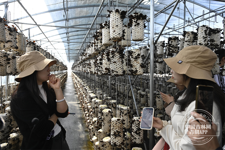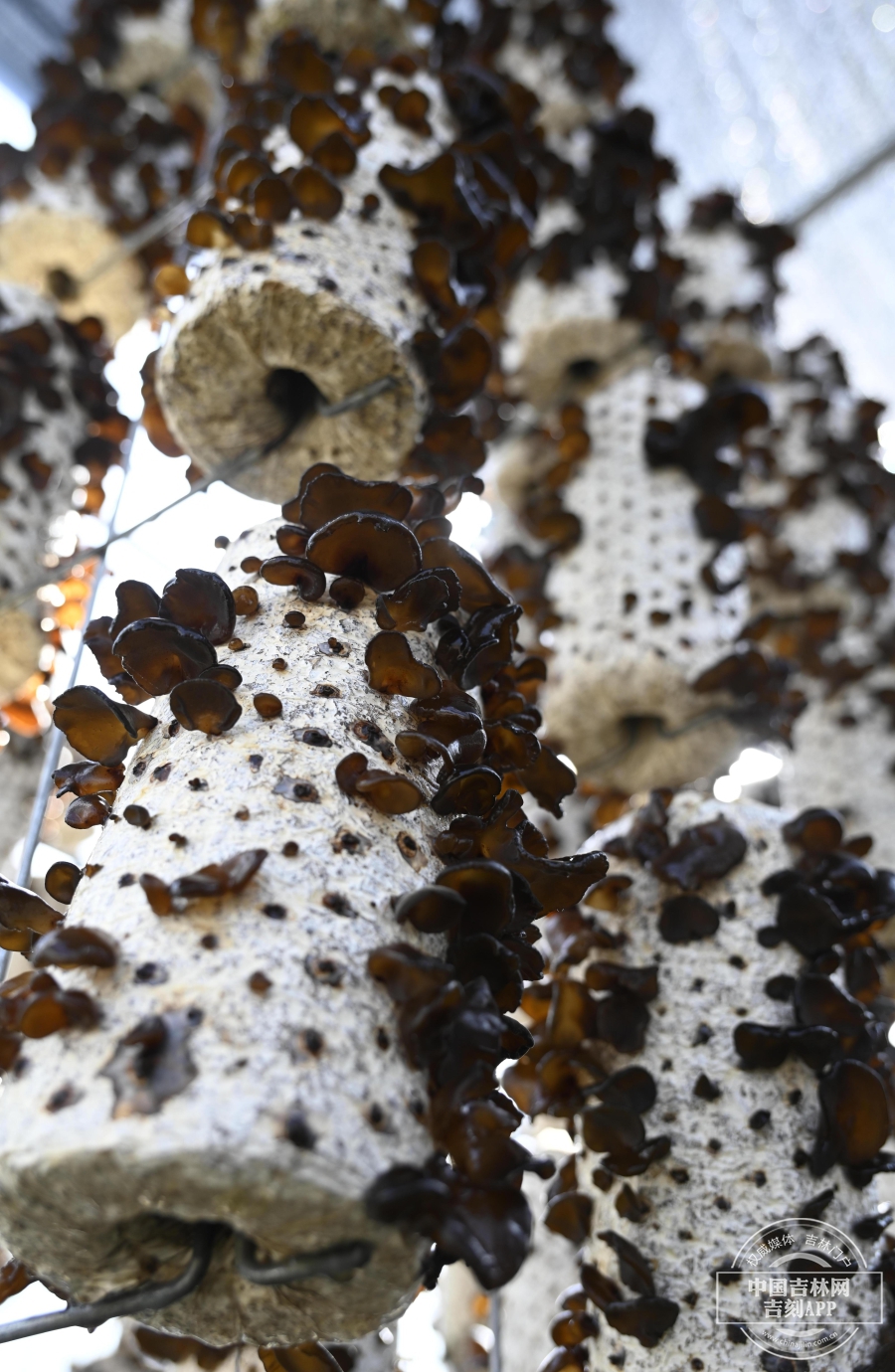 木耳基地里,一排排整齐排列的木耳菌棒上,黑木耳长势喜人