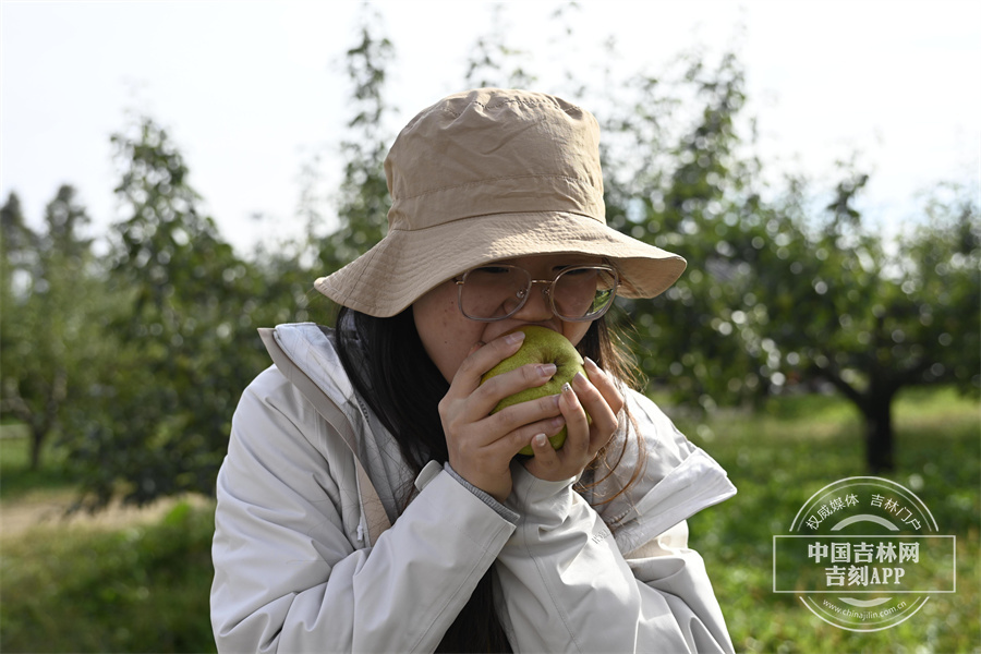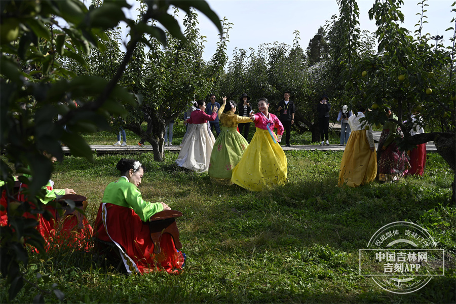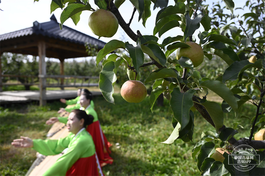 采访团成员在万亩苹果梨园采摘苹果梨,欣赏朝鲜族歌舞,体验延边农业之乐