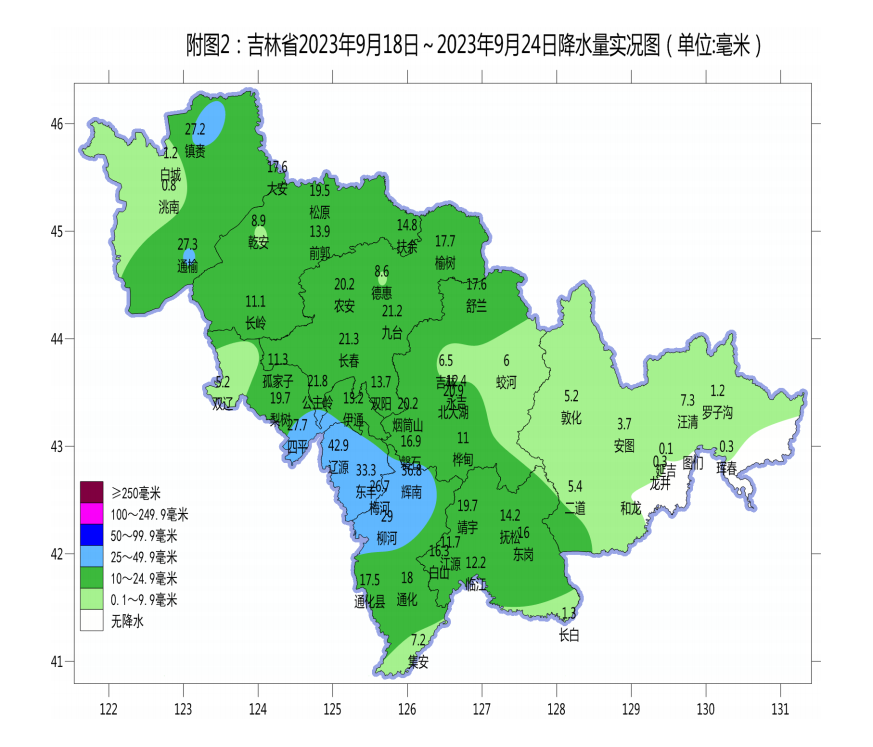 降水稍多。全省平均降水量14.4毫米,较常年多24%。其中,白山、延边和长白山保护区较常年少18%~87%,其他地区较常年多5%~333%。